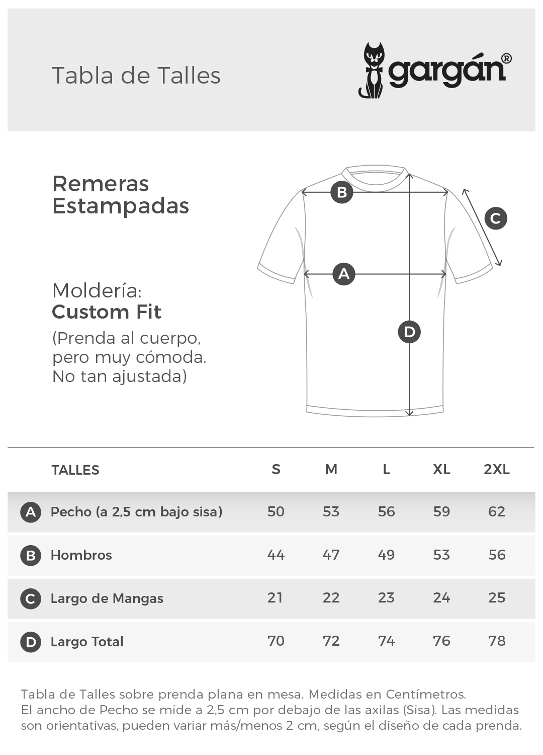 Tabla de Talles (Sobre prenda plana en mesa). Medidas en Centímetros. Pecho se mide a 2,5 cm x debajo de la axila.